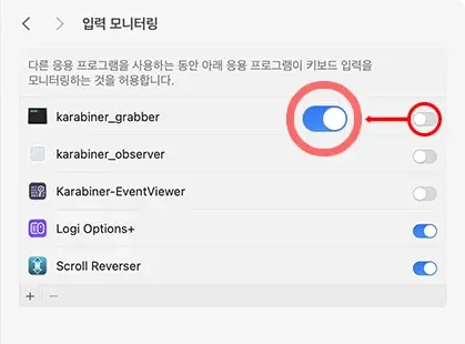 입력 모리터링에 표시되는 카라비너 관련 항목은 총 3가지이다. 이 중 karabiner_grabber의 입력 모니터링 권한을 허용하면 키입력을 재매핑할 수 있다.